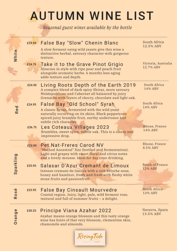Our house wines are from the fantastic False Bay in South Africa. We have a Chenin Blanc, a Syrah and a Cinsault rose on offer, along with our house fizz which is the very tasty Salasar de Limoux Cremant.