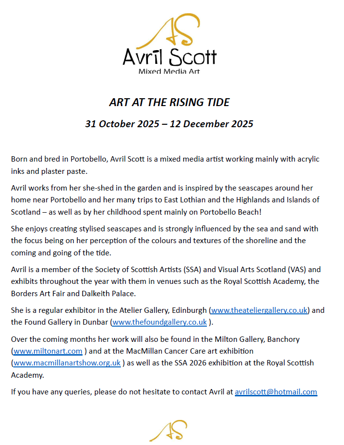 - Avril Scott Exhibition – Friday 31st October to Friday 12th December 2025